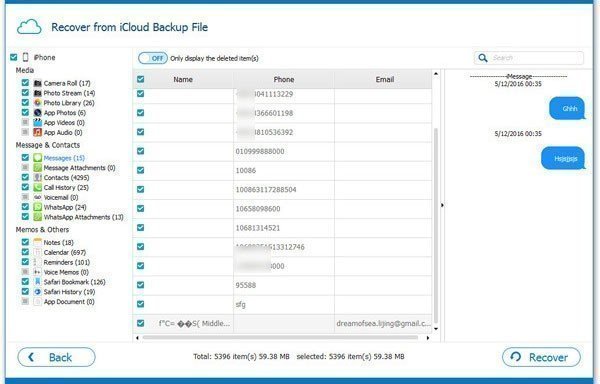 Step 3. After downloading the backup, you can view the data in that backup. Select the WhatsApp messages and then click Recover.