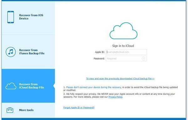 Step 1. Download and install iCloud Android Transfer to computer. Select Recover from iCloud Backup File on the left. Sign in your Apple ID.