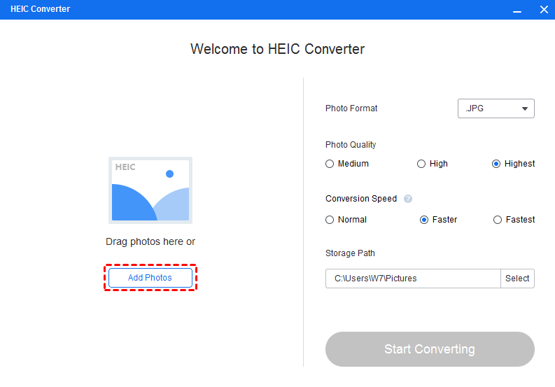 Step 2. Click the "Add Photos" button to select the HEIC format pictures you want to convert, or directly drag the pictures to the interface.
