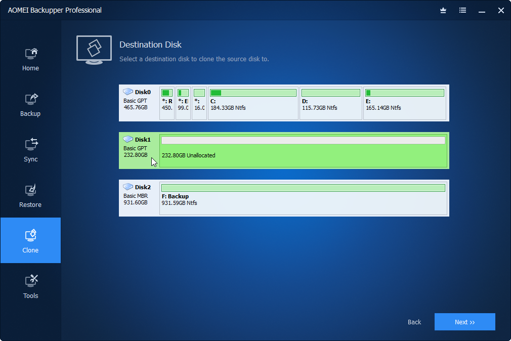 Step 4. Select the SSD as destination disk (here is Disk1), and then click "Next" to continue.