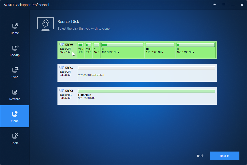 Step 3. Select the hard drive as source disk (here is Disk0), and then click "Next" to continue.