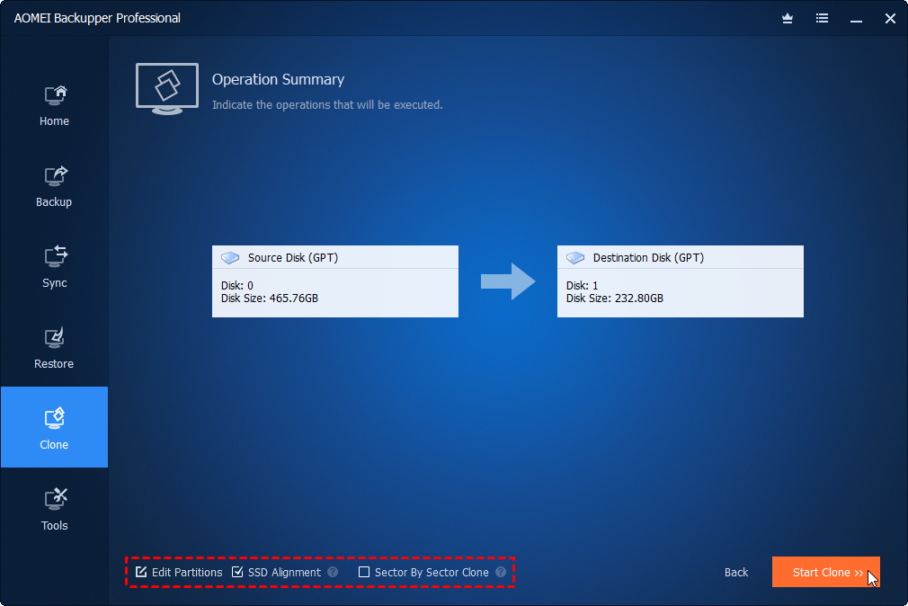 Step 5. You are almost done. On the operation summary window, there are three options available to choose. At last, click "Start Clone".