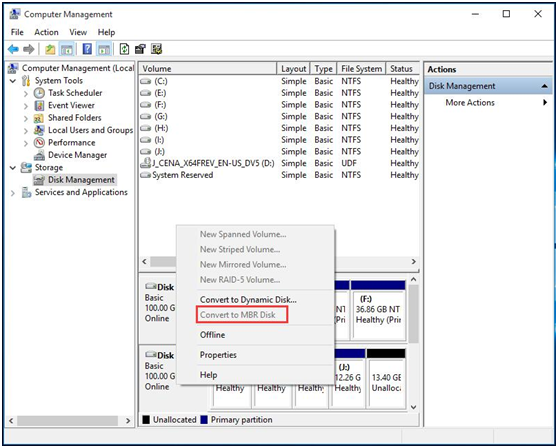 Se pudermos encontrar a opção "Converter em disco MBR" disponível na lista de menus, o sistema já foi instalado no disco GPT, o que também significa que este computador suporta inicialização UEFI. No entanto, se o computador não oferecer suporte ao UEFI Boot, veremos "Converter no disco GPT" no menu suspenso.
