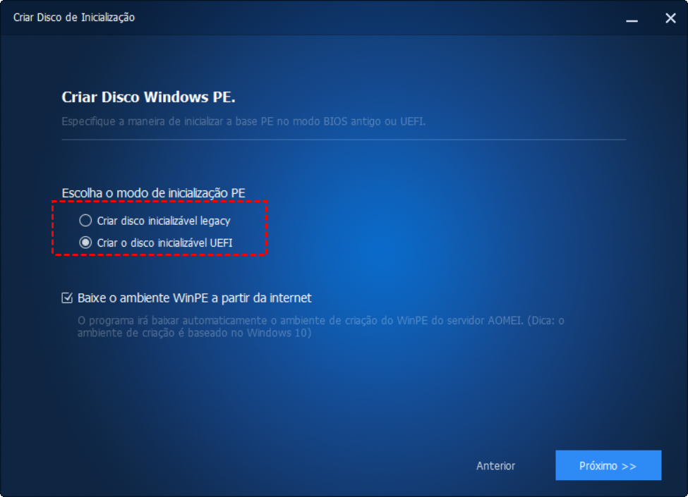 Depois que o modo de inicialização foi alterado na interface do BIOS, podemos inicializar o computador a partir do CD ou da unidade flash USB. Além disso, podemos restaurar a unidade do sistema com base na inicialização do UEFI executando o AOMEI Backupper integrado no CD inicializável ou na unidade flash USB.