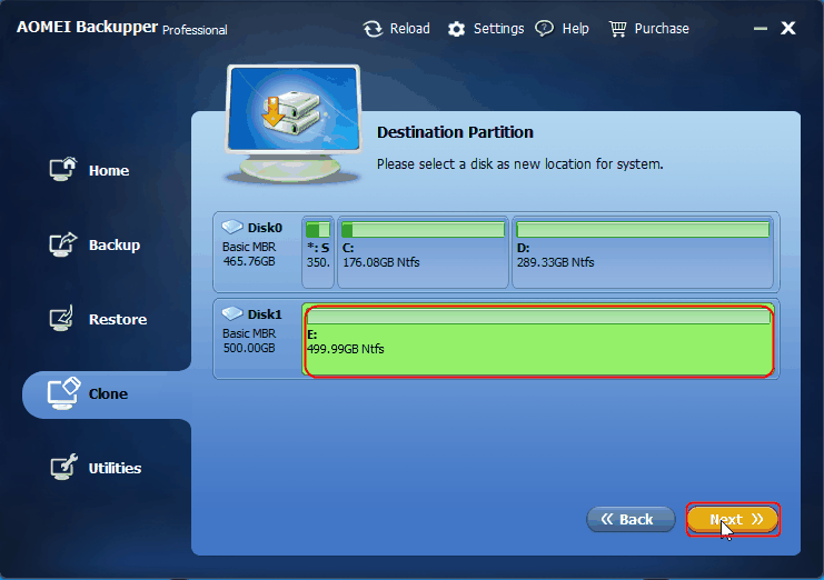 Passo 2. A origem do sistema é escolhida por padrão, e o que você precisa fazer é escolher o SSD que você preparou como disco de destino. Clique em Próximo.