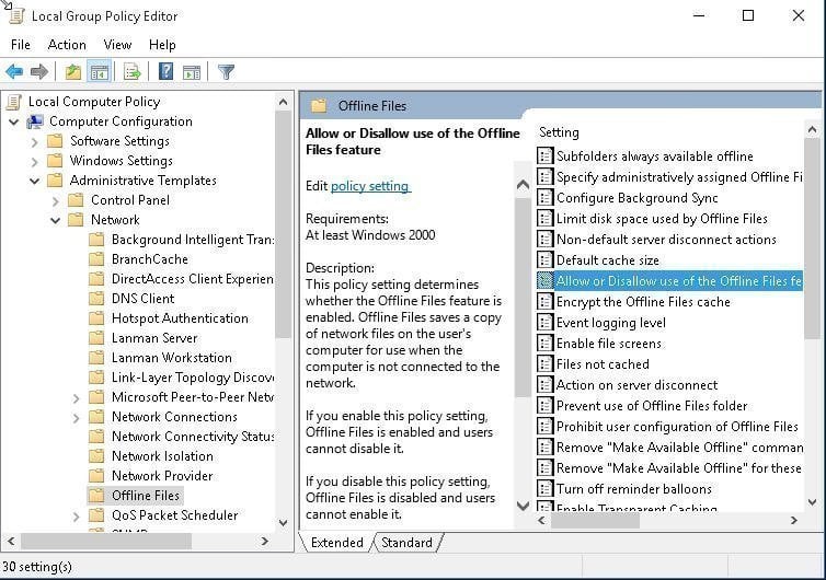 3. feche a diretiva de grupo local e acesse a Central de Sincronização e veja se Arquivos Offline estão habilitados.