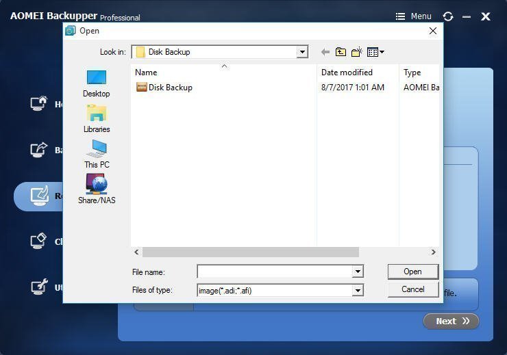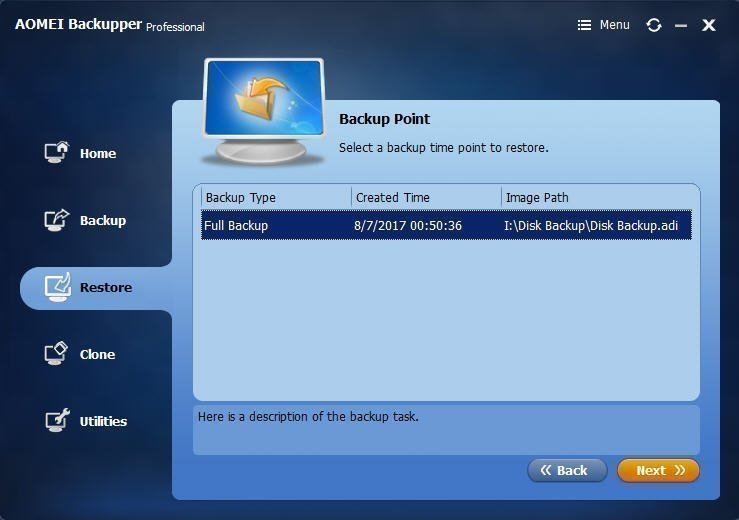 AOMEI Backupper Professional é um poderoso software de backup e restauração projetado para o Windows 10/8/7. Ele permite que você crie backup do sistema, backup em disco e backup de partição com alguns cliques do mouse. E então você pode restaurar a imagem de backup, se necessário.