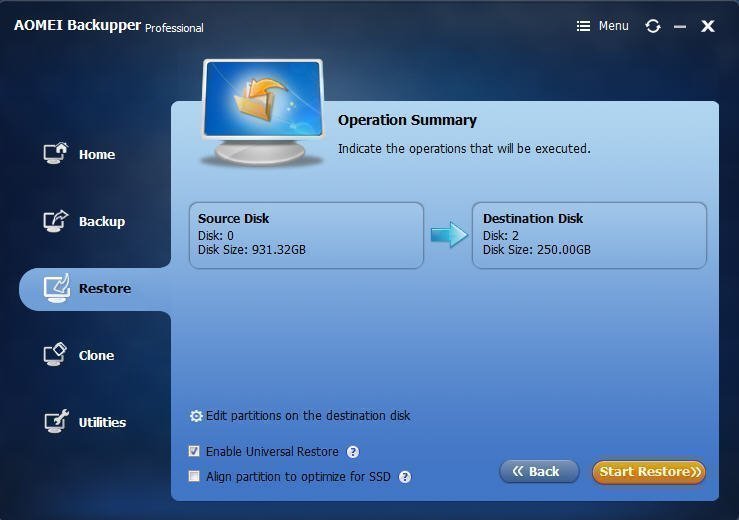Passo 5. Aí vem a tela Resumo da operação, marque a opção "Ativar Restauração Universal", e clique em "Iniciar Restauração".