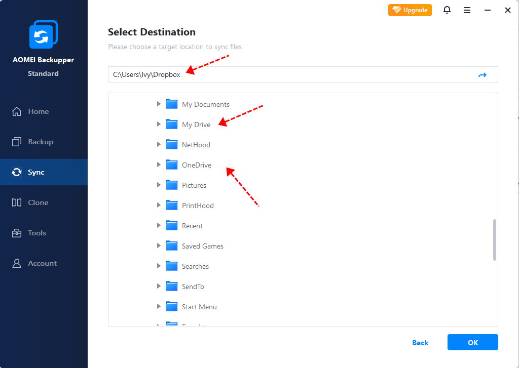 (Optional) If you cannot find OneDrive from the list, go back to click Select a local path to choose the OneDrive local folder manually. Most cloud services folders are located by default in the C: \Users\UserName\OneDrive directory.