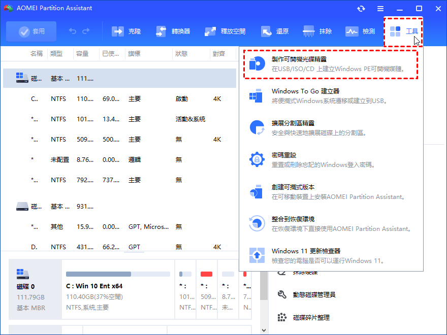此外,還有一些高階功能來解決各種分割區錯誤。您可以將MBR轉換成GPT,將動態磁碟分割轉換成基本磁碟分割。建立一個USB開機磁碟使Windows正常啟動等等。