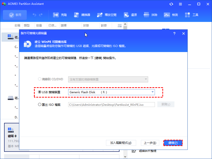 步驟二、選擇儲存可啟動媒體路徑時,選擇 "USB開機裝置"。然後點選 "繼續",開始製作開機碟。