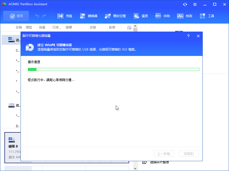 步驟一、準備一個空閒的USB隨身碟,並將其連線到一個健康的Windows電腦,點擊上方按鈕下載並安裝AOMEI Partition Assistant Professional。在主介面的左側面板上點選 "製作可開機光碟精靈"。然後點選 "下一步"。