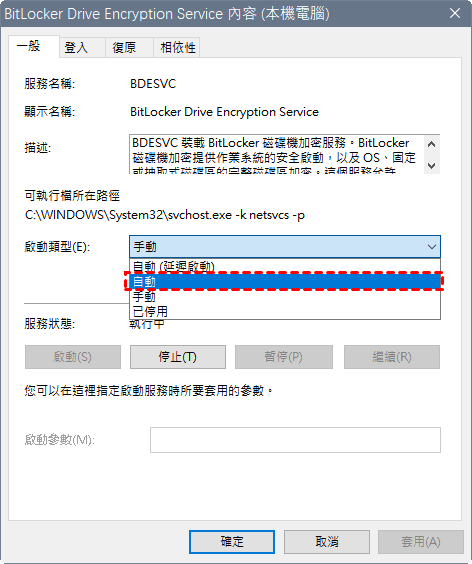3. 在彈出的內容視窗中,將啟動類型設為「自動」,確保服務在系統啟動時能夠自動啟動。然後,點擊確定儲存設定。