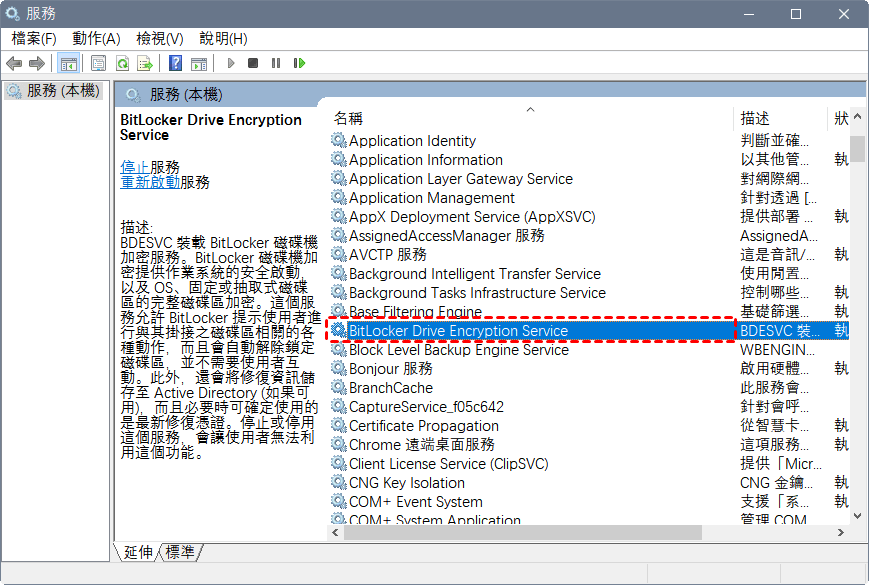 2. 在服務列表中找到 BitLocker Drive Encryption Services,右鍵點擊它並選擇內容。