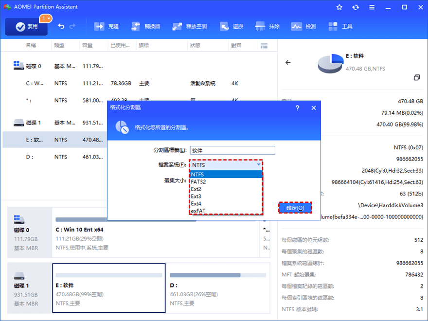 要想解決這個問題,AOMEI Partition Assistant 可以幫助您格式化並變更為另一個合適的檔案系統。