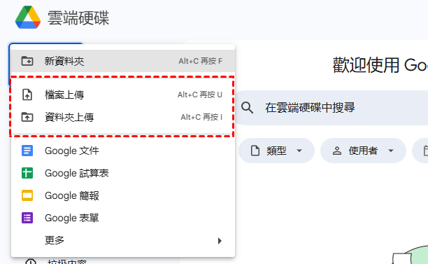 2. 登入您的 Google 雲端硬碟。點擊新建並選擇檔案上傳或資料夾上傳。