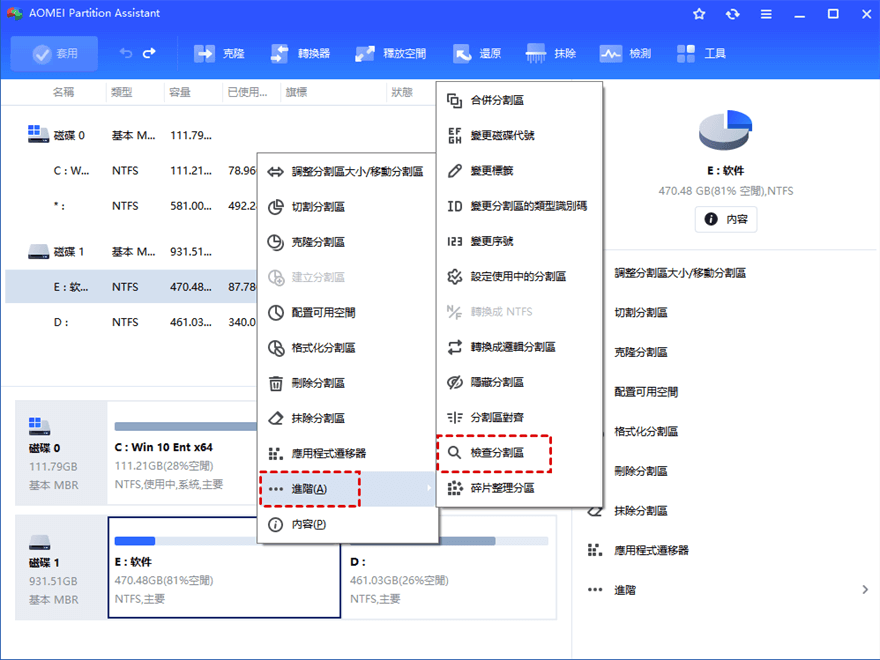 1. 開啟已安裝的軟體,右鍵點選外接硬碟,選擇進階,再選擇檢查分割區。