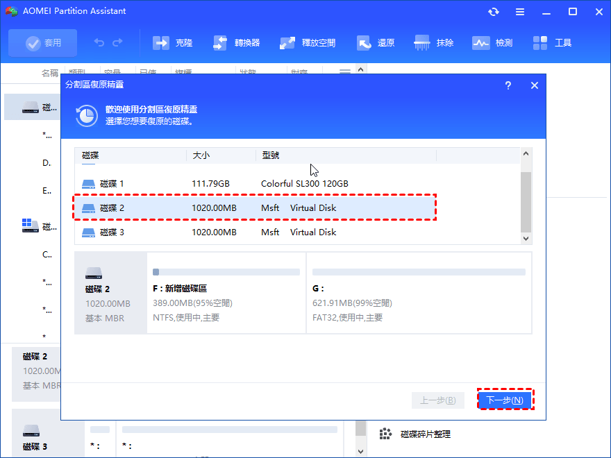 2. 選擇想要復原的磁碟,點擊下一步按鈕。