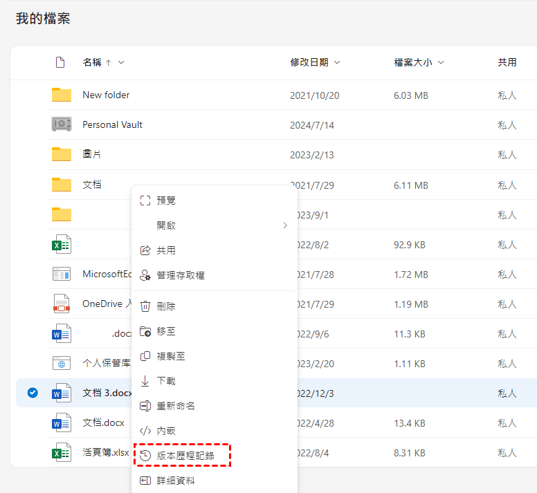 方法5. 從版本歷程記錄將 OneDrive 檔案救回(已開啟版本歷程記錄)
