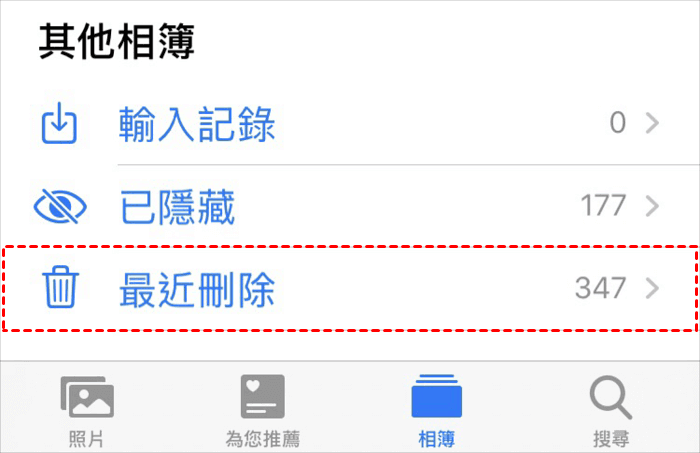 iPhone手機中內建了一個“最近刪除”資料夾,其功能與Windows資源回收筒類似,可以幫助您儲存所有刪除的照片。請注意,您的照片最多只能在“最近刪除”資料夾中儲存30天時間,一旦超過這個期限,照片就會被自動永久刪除。