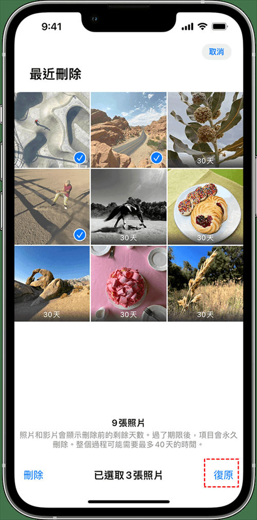 如果您想要同時還原多張照片,可以先點擊右上角的選取按鈕,再勾選所有想要復原的照片,點擊右下角的全部復原按鈕。