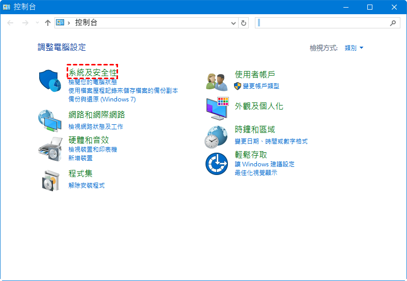步驟1. 在Windows搜尋框内輸入“控制台”,開啟後點擊“系統及安全性”。