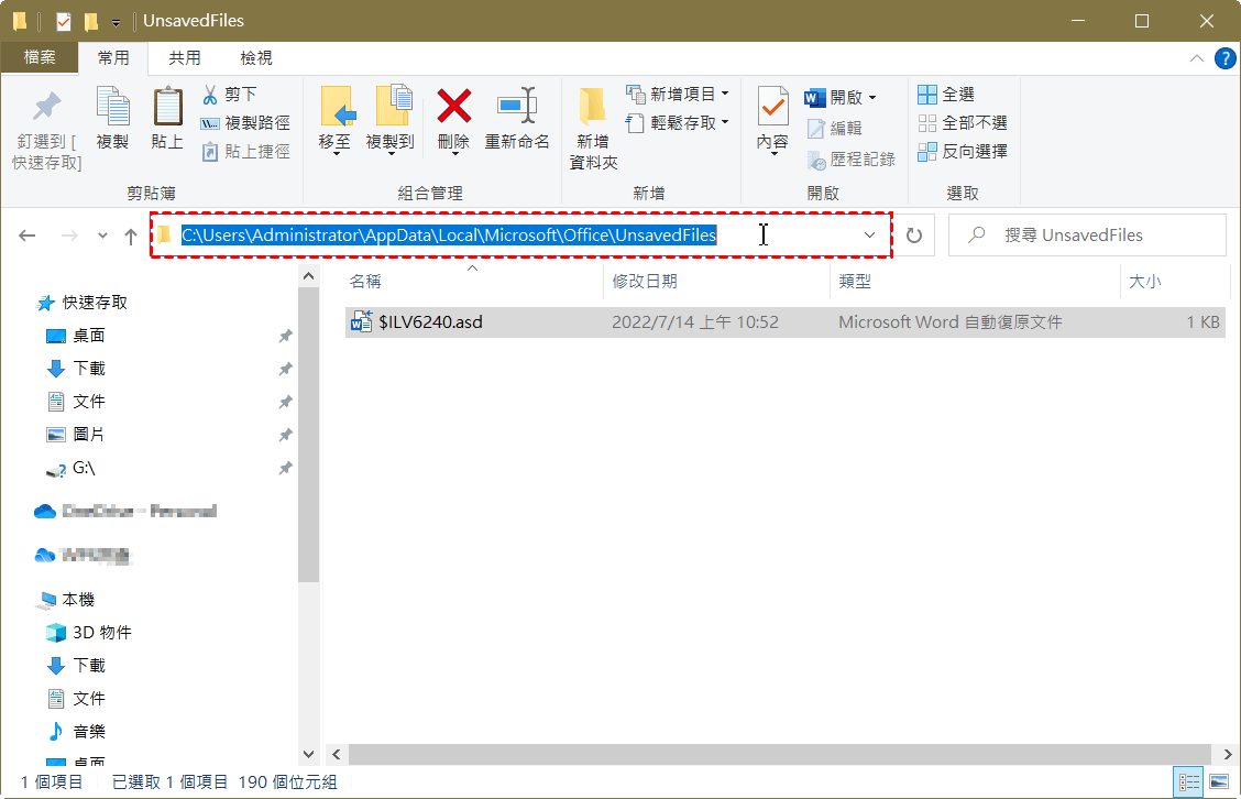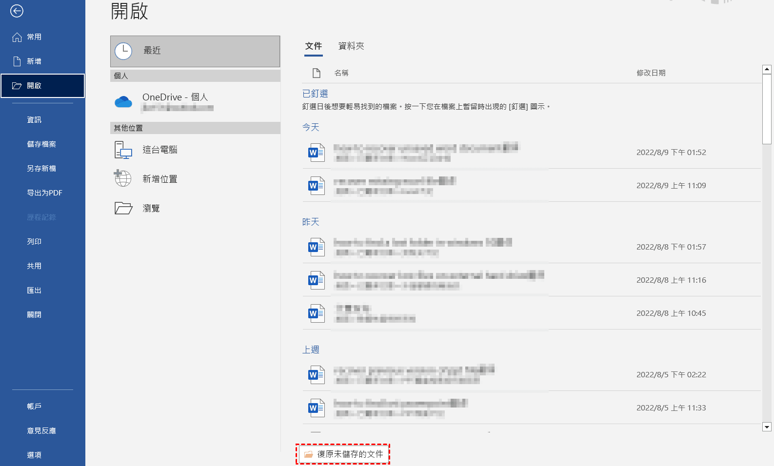 - C:\使用者\使用者賬戶\AppData\Local\Microsoft\Office\UnsavedFiles