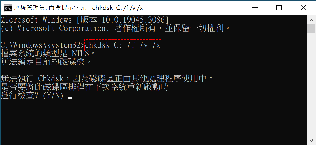 2、然後,請輸入「chkdsk C: /f /v /x」並按下Enter鍵。