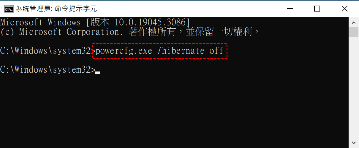 2、然後,您需要輸入「powercfg.exe /hibernate off」並按下Enter鍵,C槽中的記憶體暫存檔就會被自動刪除。