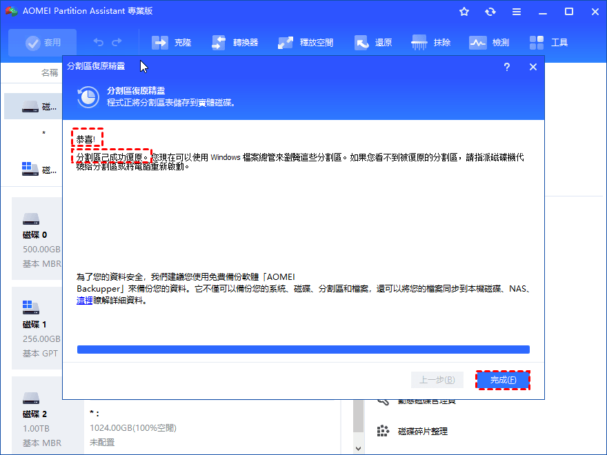 4. 磁碟分割區復原過程將在幾秒鐘內完成,並有訊息顯示 "恭喜"。點選 "完成"退出該視窗。