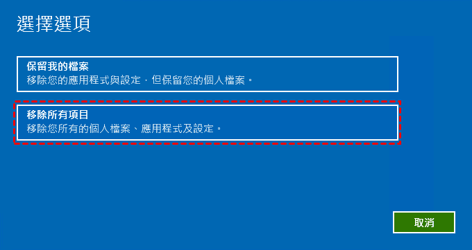 3、在新的視窗中,根據實際情況來選擇是否保留檔案。如果需要將華碩筆電移交給其他人,建議選擇移除所有項目。
