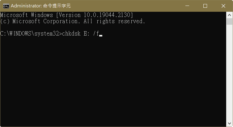 2、在命令提示字元視窗,輸入chkdsk 磁碟機代號: /f,並按下Enter鍵。此命令列將幫助您修復隨身碟中可能存在的邏輯錯誤。