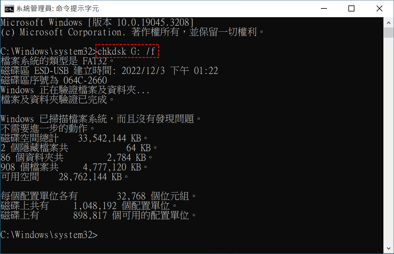 4、輸入chkdsk G: /f並按下Enter鍵。請注意將G替換為記憶卡的磁碟機代號。