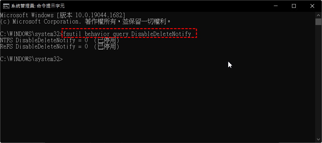 步驟2. 在命令提示字元視窗中輸入“fsutil behavior query DisableDeleteNotify”,然後按 “Enter”鍵。