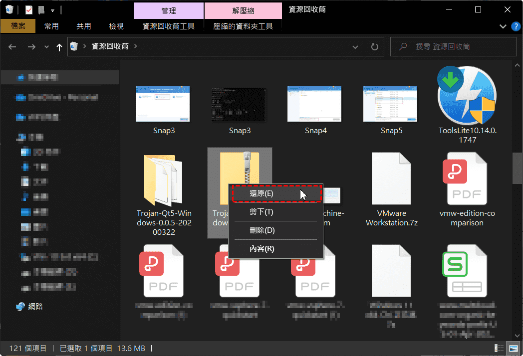 步驟3. 右鍵點選您所需要的檔案,然後點選“還原”,或者直接將您需要的檔案從資源回收筒中拖出來。
