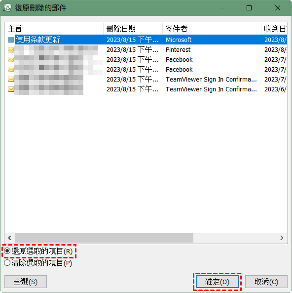 2、然後,您可以檢視到Exchange伺服器中儲存的永久刪除郵件。從列表中選取想要恢復的永久刪除郵件,點擊“還原選取的項目” > “確定”。