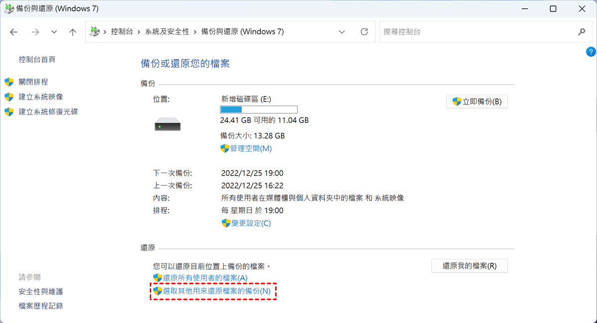 如果您在Windows 11更新前,透過“備份與還原”工具建立過完整的系統備份,那麼就可以透過備份來實現電腦資料救援。