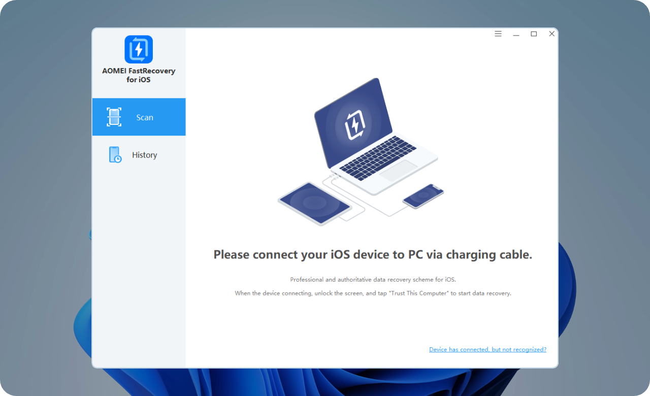 在您的PC上安裝AOMEI FastRecovery for iOS,然後,只需3個簡單步驟即可開始iPhone資料恢復 - “連接”、“掃描”、“復原”。