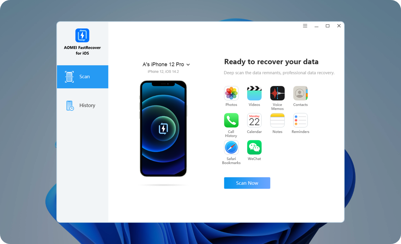 透過深度掃描和快速掃描,AOMEI FastRecovery for iOS可以幫助使用者快速掃描iOS裝置中已刪除或遺失的資料。