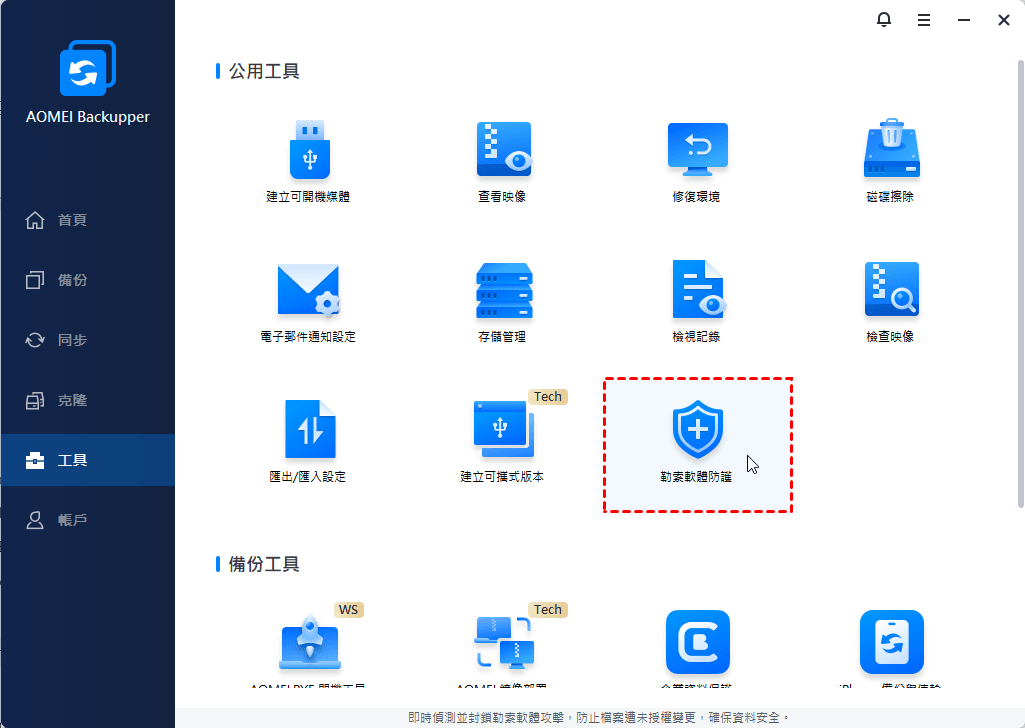 步驟1. 點選左側選項卡中的“工具”,然後在“常用工具”下選擇“勒索軟體防護”工具。