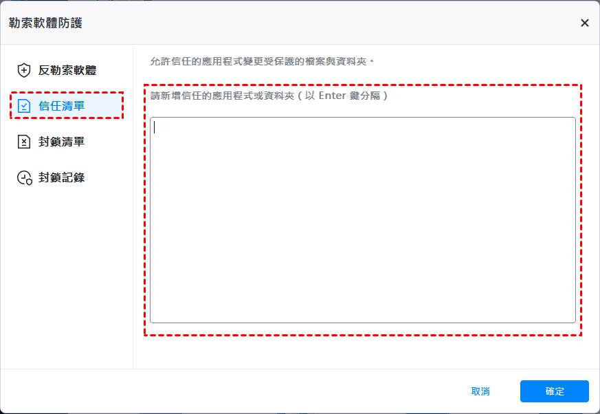 信任清單中的應用程式可以修改或刪除受保護的檔案/資料夾,並且這些應用程式對受保護的檔案/資料夾的操作不會被封鎖。單擊“確定”儲存設定。