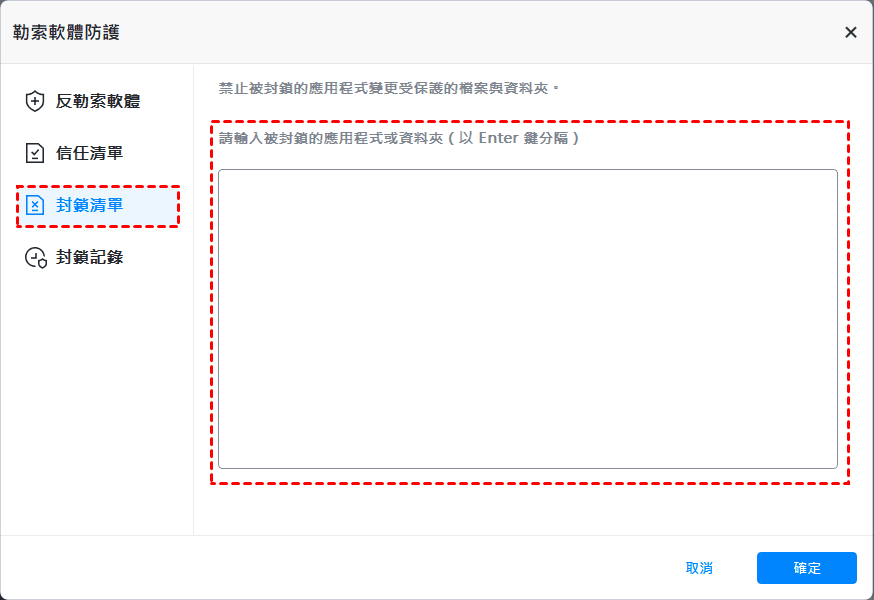 封鎖清單中的應用程式將被直接禁止修改或刪除受保護的檔案/資料夾。封鎖清單中的程式不會收到任何提示。單擊“確定”儲存設定。