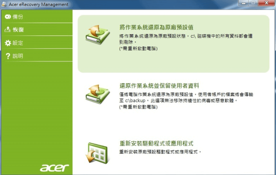 請注意Acer Recovery Management與Windows作業系統一起升級。而且具體操作在不同的作業系統中也會有所不同。