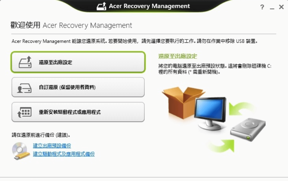 如果您無法使用Acer Recovery Management,或者希望在不同情況下和不同品牌的電腦上使用統一的解決方案,您可以直接跳轉到第3種方法。