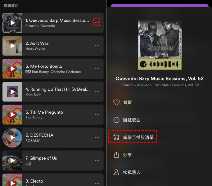 步驟2. 尋找您喜歡的歌曲,然後點擊右側的「三點」圖示 > 點擊「新增至播放清單」將音樂下載到手機。