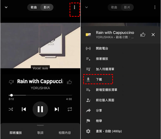 步驟2. 點擊播放後,點擊右上角的「三點」圖示 > 點擊「下載」。