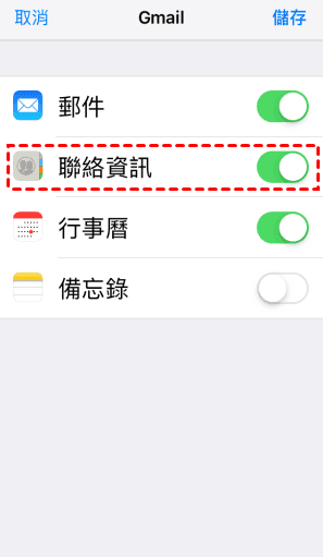 4. 在顯示的選項中,切換聯絡資訊以啟用同步功能,然後點擊儲存。