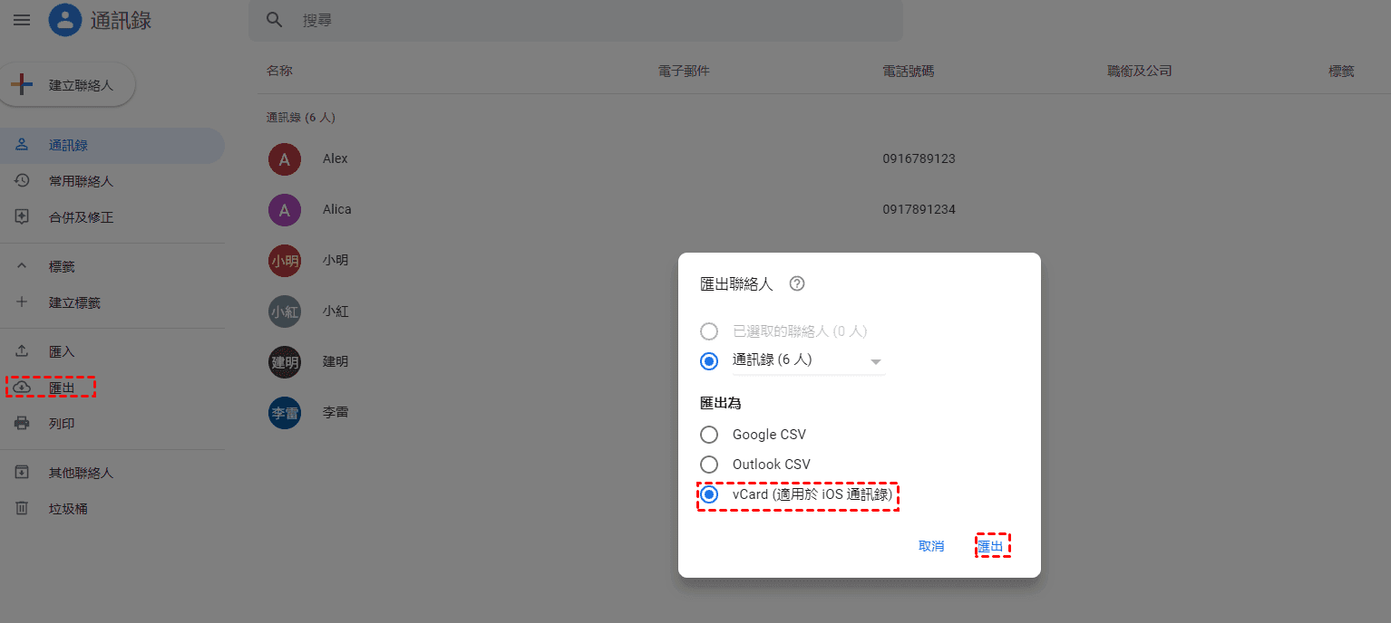 2. 在左側面板中,點選更多 > 匯出,選擇 vCard 格式,然後點擊匯出按鈕,將您的聯絡人下載到電腦。