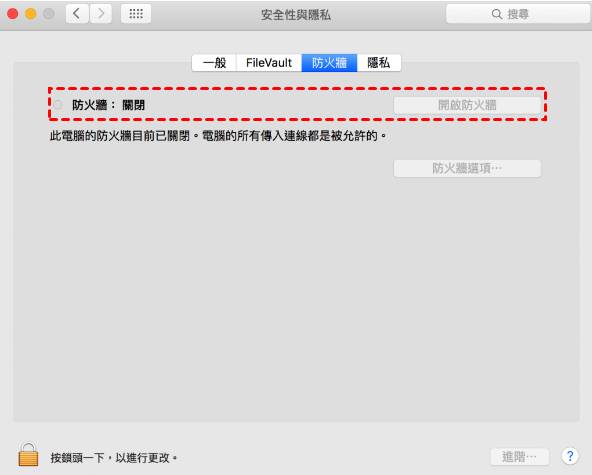 步驟3. 進入安全性與隱私視窗後,查看「防火墻」和「隱私」是否有啟用,如果沒有請啟用。