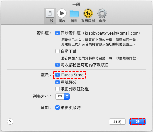 步驟2. 在「音樂」的設定畫面中,勾選「iTunes Store」選項 > 點擊「好」儲存設定。